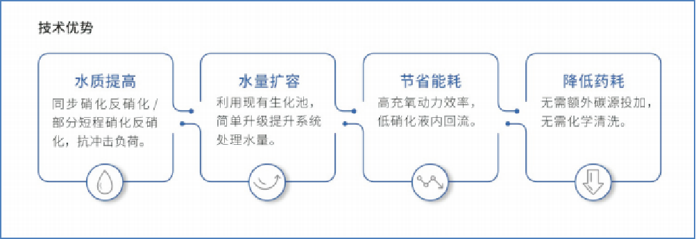 MABR工艺通过增加膜箱的方式,可以增加生化系统中硝化菌数量,用以对进水氨氮在MABR 膜箱区实现硝化反应,这将大大增加系统的处理能力和系统运行的稳定性。尤其是在冬季温度较低的时候,即使有一定的生物量损失,这种菌种效应也会加速系统尽快恢复,剩余的氨氮在现有好氧曝气池中发生硝化反应得以去除。MABR工艺的无泡曝气技术,可以大大节约曝气能耗,并且可实现原址扩容及不停水改造,切实响应国家“碳中和”、“碳达峰”的战略背景,具备未来水厂主流工艺潜质,满足城市发展对于污水处理提质和提量的双重要求。