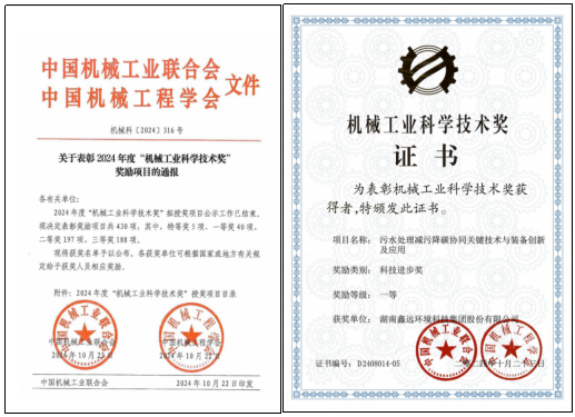 近日,中国机械工业联合会、中国机械工程学会正式公布了2024年度“机械工业科学技术奖”奖励项目,湖南鑫远环境科技集团股份有限公司(以下简称鑫远股份)参与的“污水处理减污降碳协同关键技术与装备创新及应用”项目荣获科技进步奖一等奖。